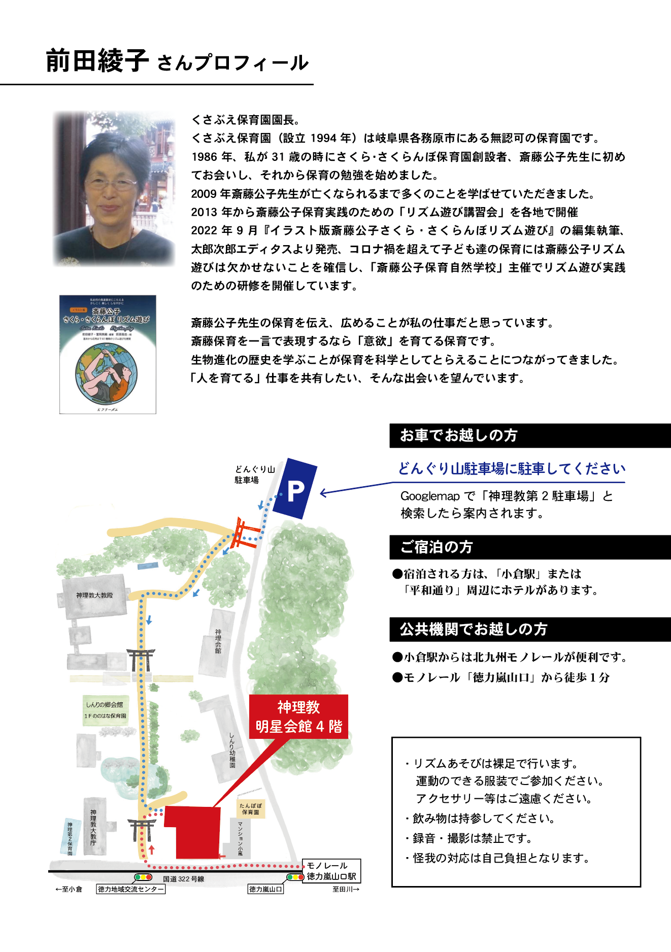 5月2日(土)・3日(日)に光楽園主催で、くさぶえ保育園園長の前田綾子先生をお招きして、「子どもの育ちをみつめて 〜楽しいリズムあそびの紹介〜 第二弾」を開催いたします。